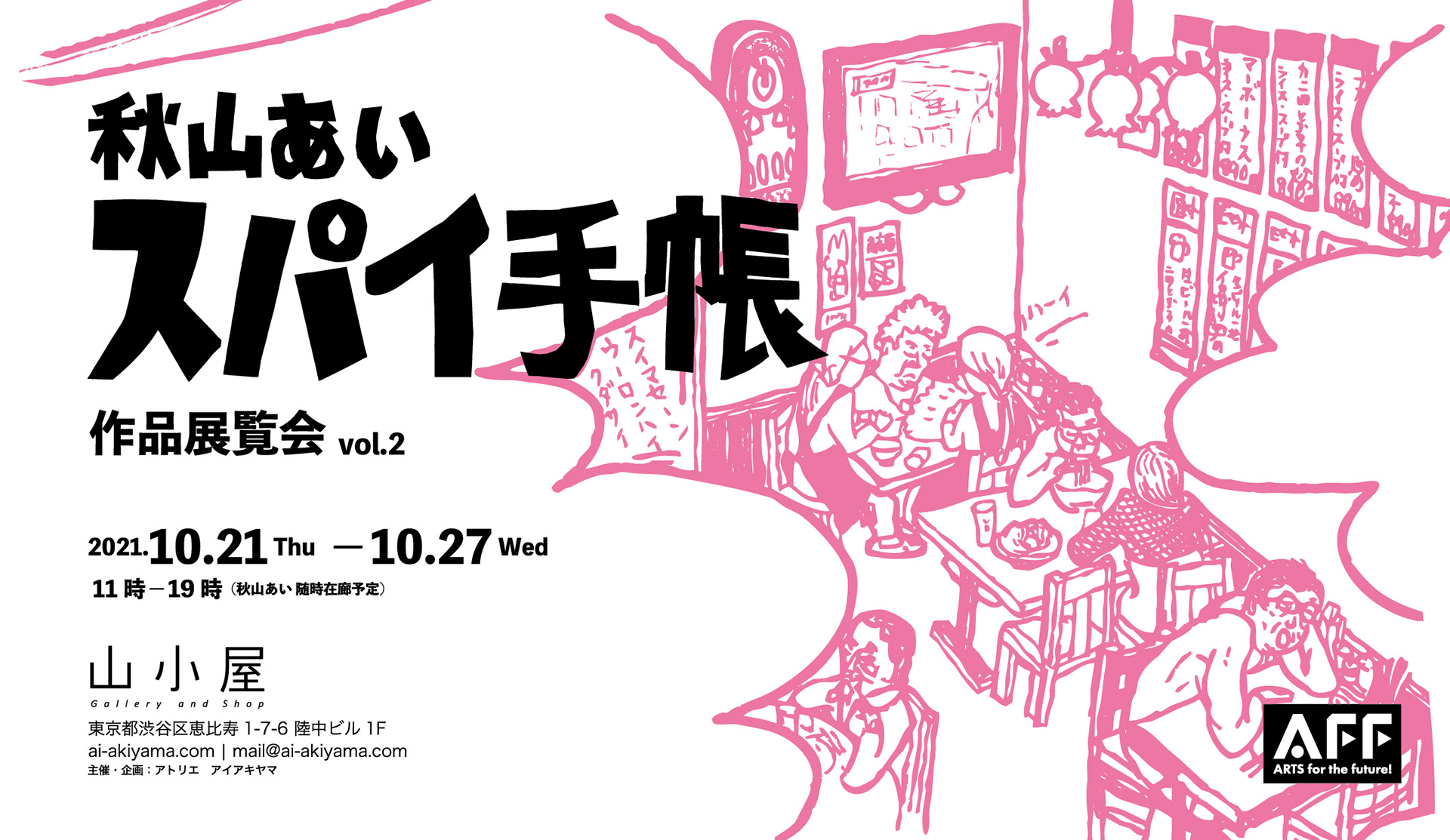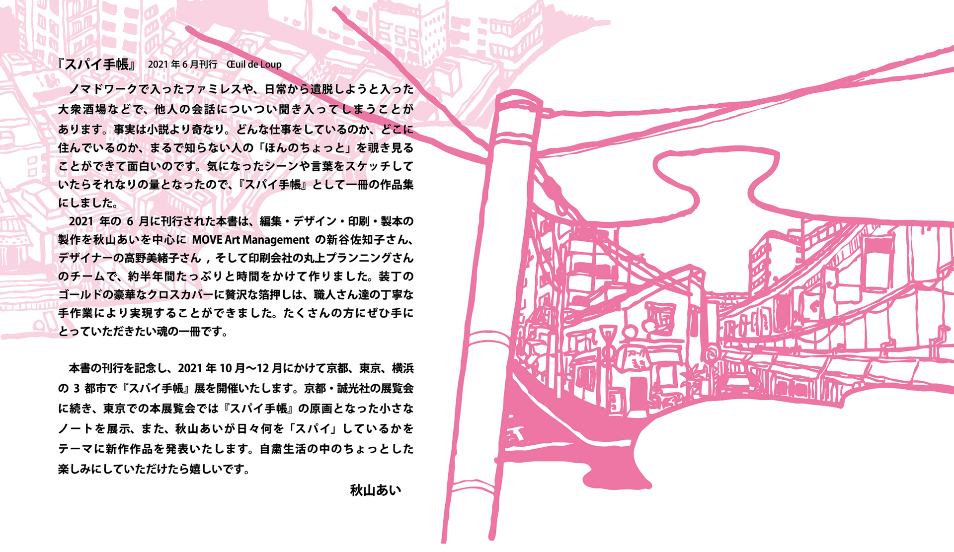 『スパイ手帳』の原画となった小さなノートを展示し、また、秋山あいが日々「スパイ」したモノたちをテーマとした作品を発表。
