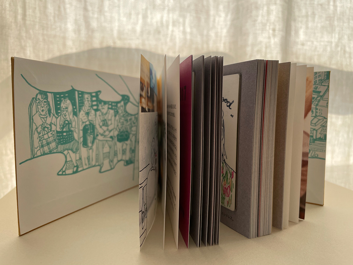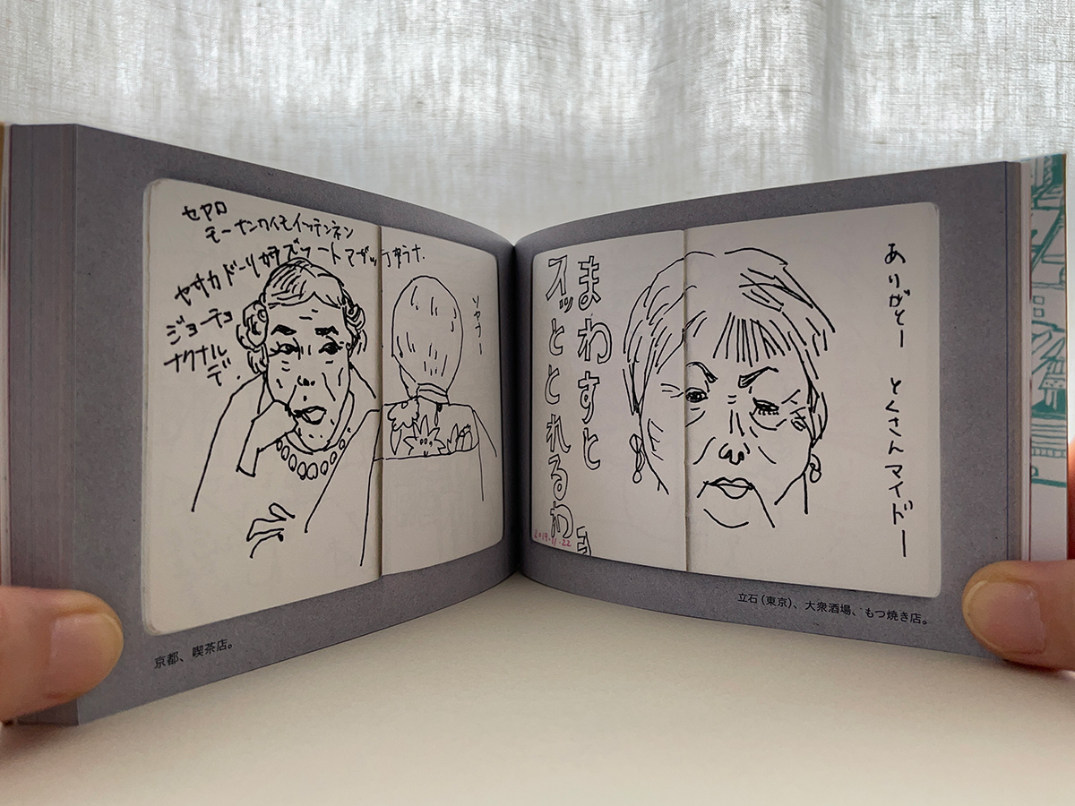 外出時には常にお気に入りのペンが入った筆箱とそれに収まる小さな小さなノートを持ち歩いています。ノマドワークで入ったファミレスや、日常から遺脱しようと入った大衆酒場などで、他人の会話についつい聞き入ってしまいます。事実は小説より奇なり。どんな仕事をしているのか、どこに住んでいるのか、まるで知らない人の「ほんのちょっと」を覗き見することができて面白いのです。気になったシーンや言葉をついついスケッチしていたらそれなりの量となってしまいましたので、一冊の作品集として『スパイ手帳』を編集しました。行き当たりばったりで遭遇した、そこらへんに散らばったそれぞれの人生の、ほんの一瞬を盗み描いた一冊です。あとがきは青森県立美術館学芸員の工藤健志さんが書いてくださいました。